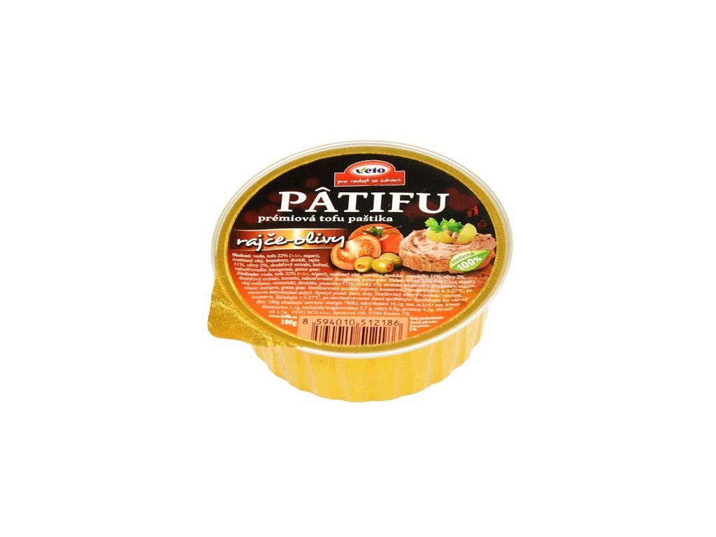PATIFU paštika s rajčaty a olivami je pomazánka rostlinného původu vhodná jak pro vegany, vegetariány, tak třeba pro celiaky nebo diabetiky. Je chutnou součástí zdravého jídelníčku jako náhrada masa. Navíc se jedná o český výrobek, který neobsahuje glutamáty ani konzervanty, a přesto se díky praktickému balení hodí na dovolenou, do práce nebo do školy. Složení: voda, tofu 22% (SÓJA, nigari), řepkový olej, brambory, droždí, rajče 11%, olivy 2%, drožďovýt extrakt, koření, zahušťovadla: karagenan, guma guar. Výživové údaje na 100g: energetická hodnota 746kJ/178kcal, tuky 14,6g z toho nasycené mastné kyseliny 1,2g, sacharidy 6,5g z toho cukry 1,6g, bílkoviny 4,5g, sůl 1,5g EAN: 8594010512186Doplňkové parametry
