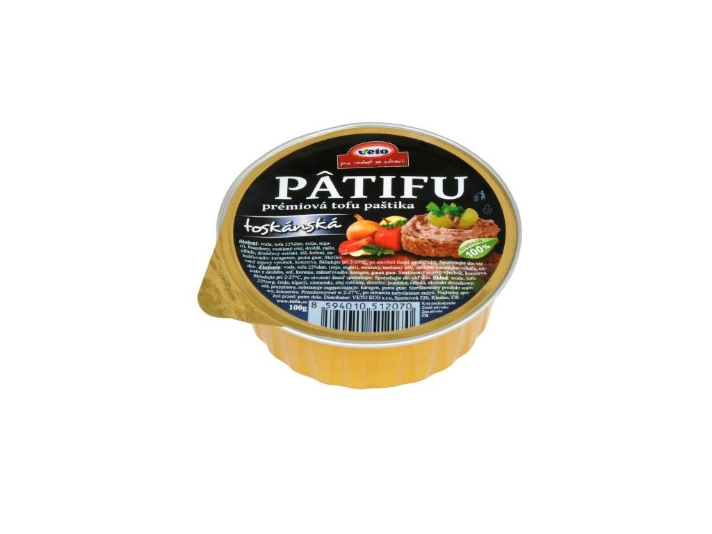 Toskánská paštika je pomazánka rostlinného původu vhodná jak pro vegany, vegetariány, tak třeba pro celiaky nebo diabetiky. Je chutnou součástí zdravého jídelníčku jako náhrada masa. Navíc se jedná o český výrobek, který neobsahuje glutamáty ani konzervanty, a přesto se díky praktickému balení hodí na dovolenou, do práce nebo do školy. Složení: voda, tofu 22% hm. (SÓJA, nigari), brambory, rostlinný olej, droždí, rajče, cibule, drožďový extrakt, sůl, koření, zahušťovadlo: karagenan, guma guar. Výživové údaje na 100g: energetická hodnota 970kJ/232kcal, tuky 21,8g z toho nasycené mastné kyseliny 1,6g, sacharidy 4,11g z toho cukry 0,7g, bílkoviny 4,3g, sůl 1,5g EAN: 8594010512070Doplňkové parametry