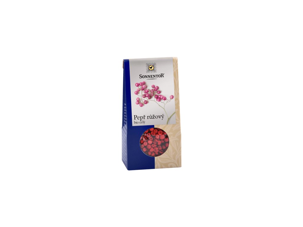 Pepř růžový není příbuzný s pepřem černým. Má jemnější, sladší aroma - méně ostré. Složení: pepř růžový celý*. *produkt kontrolovaného ekologického zemědělství. Používá se ke zjemnění předkrmů, salátů, zeleniny, omáček, do pokrmů z ryb i masa. EAN: 9004145007314Doplňkové parametry