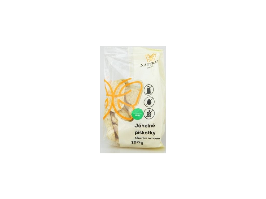 Jahelné piškotky s lesním ovocem s rýžovým sirupem, bez lepku, vajec a mléka. Složení: kukuřičný škrob, čiroková mouka, guarová guma, rýžový sirup - 8%, neztužený kokosový olej, bambucké máslo, kousky lesního ovoce, (malino-jahodovo-borůvkové pyré, glukózový sirup, cukr, slunečnicový olej, pektin), jahelná mouka - 10%, rýžová mouka, emulgátor, lecitin slunečnicový. Výživové údaje na 100g: energetická hodnota 1713kJ/486,88kcal; tuky 5,2g z toho nasycené mastné kyseliny 4,82g; sacharidy 84,9g z toho cukry 29,6g; bílkoviny 4,6g; sůl 0,01g EAN: 8594010318054Doplňkové parametry
