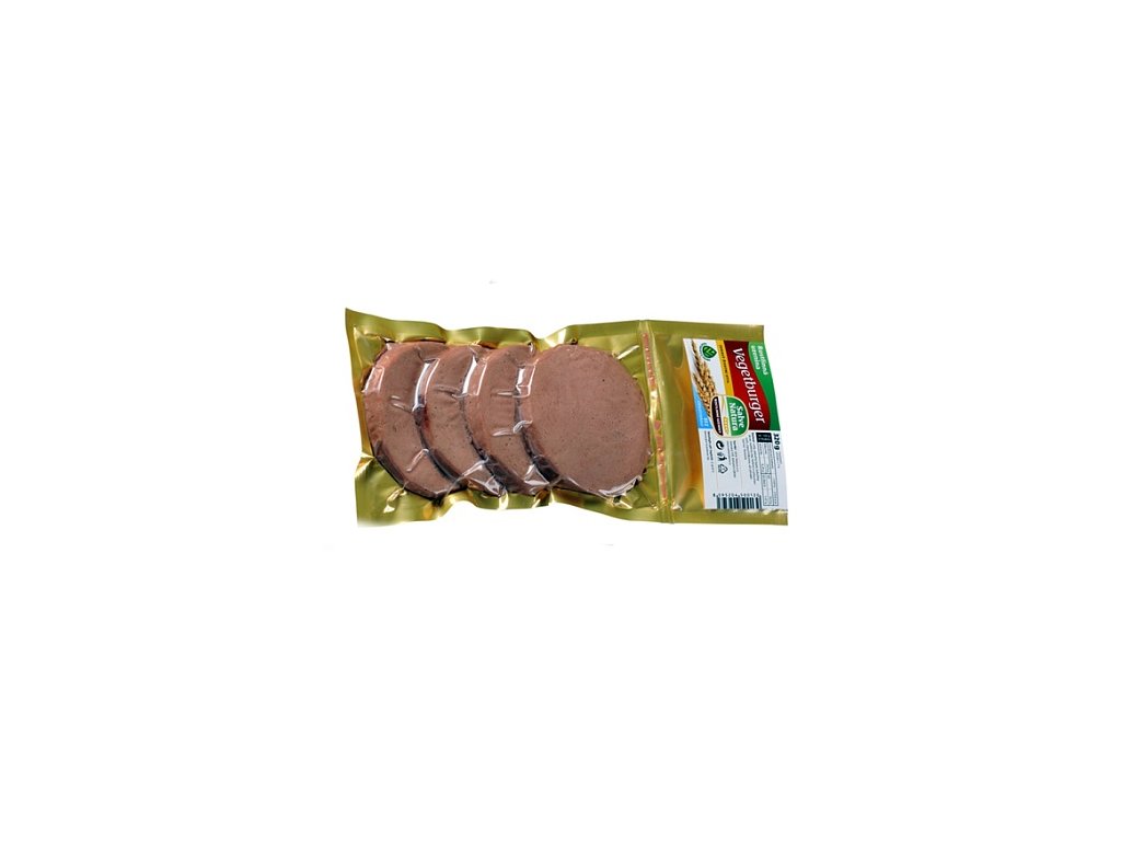 Rostlinný burger, zdravější alternativa hamburgeru, vhodný také k obalení hrašce s bramborovou nebo hrachovou kaší jako plnohodnotné jídlo. Složení: voda, PŠENIČNÝ LEPEK, kukuřičný škrob, řepkový olej, kokosový tuk, kořenící a ochucovací směs, SÓJOVÁ BÍLKOVINA, sůl, přírodní barvivo: fermenta. Výživové údaje na 100g výrobku: energetická hodnota 907,4kJ/216,7 kcal; tuky 11,5g z toho nasycené mastné kyseliny 3,01 mononenasycené mastné kyseliny 4,94g polynenasycené mastné kyseliny 3,51g; sacharidy 8,97g z toho cukry 2,59g; polyalkoholy <0,1g; škroby 6,38g; vlákniny 1,32g; bílkoviny 18,8g; sůl 1,54g EAN: 8595206500130 TENTO PRODUKT NELZE POSÍLAT PŘEPRAVNÍ SLUŽBOU, VYŽADUJE CHLAZENÉ PROSTŘEDÍ, ALE LZE VYZVEDNOUT NA PRODEJNĚ NEBO VYUŽÍT NAŠEHO ROZVOZU ŽĎÁR A OKOLÍ.Doplňkové parametry