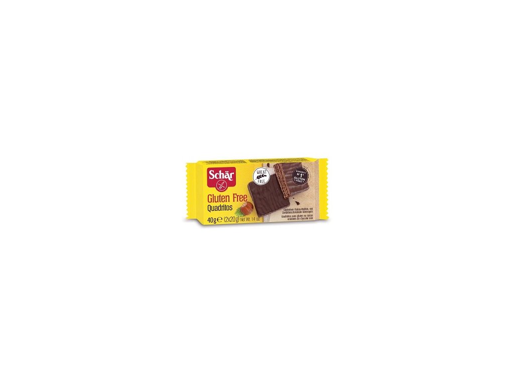 SCHAR Quadritos- oplatky bez lepku máčené v hořké čokoládě s kakaovou náplní. Složení: hořká čokoláda 42% (cukr, kakaová hmota, kakaové MÁSLO, emulátor: SÓJOVÝ LECITIN, přírodní aróma), bramborový škrob, cukr, rostlinné tuky (palmový, palmojádrový), sójová mouka, kakao 5%, LÍSKOVÉ OŘÍŠKY 2%, emulátor: SÓJOVÝ LECITIN, zahušťovadlo: guarová guma, kypřicí látky: natriumkarbonat, sušené MLÉKO. Může obsahovat stopy mandle. Výživové údaje na 100g: energetická hodnota 2259kJ/541kcal, tuky 32g z toho nasycené mastné kyseliny 21g, sacharidy 56g z toho cukry 32g, bílkoviny 5,0g, sůl 0,08g. EAN: 8008698005293Doplňkové parametry