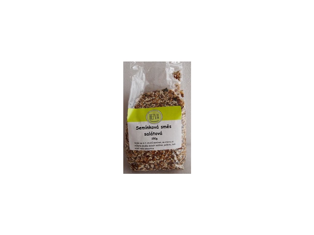 Bezva semínková směs salátová je tvořená 6-ti druhy pečlivě vybraných a zdravých semínek, se kterou si můžete skvěle doladit salátek, polévku, kaši, musli , nebo smoothie.Složení: směs semínek v různém poměru (dýně, SEZAM, slunečnice, chia, len hnědý a len zlatý).