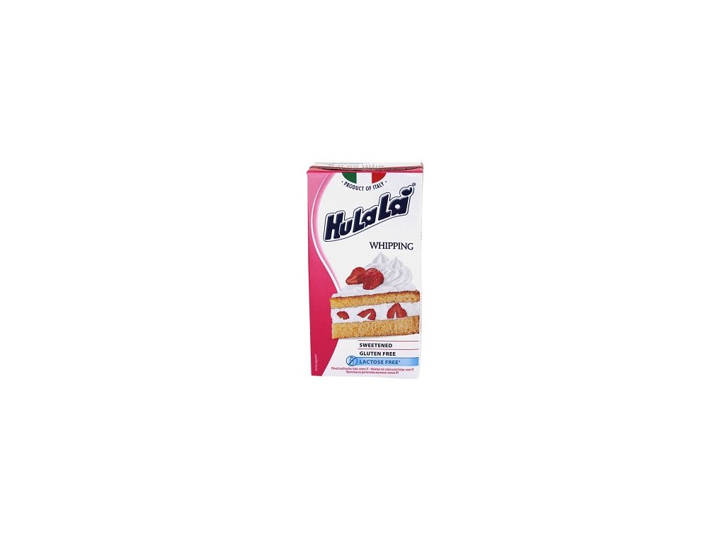 Hulala Rostlinná šlehačka. Slazený šlehačkový UHT výrobek na bázi rostlinných tuků a olejů. Ideální na zdobení dortů, na výrobu krémů a zmrzlin. Pro vylepšení objemu nášlehu se doporučuje dát výrobek alespoň na 12 hodin před použitím do lednice. Složení: voda, plně hydrogenované rostlinné tuky a oleje (27%) (tuky: palmová jádra; oleje: slunečnicový), cukr (11%), stabilizátory: E420, E463, MLÉČNÉ bílkoviny, emulgátory: E472e, SÓJOVÝ lecitin (E322), E472b, sůl, aroma, barvivo: E160a. Výživové údaje ve 100ml: energie 1280kJ/310kcal, tuky 28,5g z toho nasycené mastné kyseliny 28g, sacharidy 13,3g z toho cukry 11,4g, bílkoviny_ 0,6g, sůl 0,2g EAN: 8007990404964Doplňkové parametry