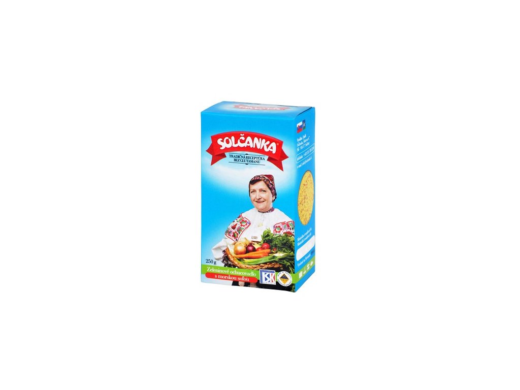 Solčanku využijete na dochucení hlavních jídel, polévek nebo třeba i pomazánek. Vyzkoušejte tradiční recepturu bez umělých látek zvýrazňujících chuť a bez umělých barviv. Složení: mořská sůl (70%), sušená zelenina (19%) (mrkev, pastiňák, petržel, celer, cibule, brambory, kukuřičný škrob), sacharóza (8%), sušené byliny (2%) (dobromysl, libeček, saturejka, bazalka, mateřídouška, meduňka, tymián, petrželová a CELEROVÁ nať, barvivo (riboflavin E101). Alergeny: Celer Výživové údaje na 100g: energie 535kJ/126kcal, tuky 0,13g z toho nasycené mastné kyseliny 0,1g, sacharidy 29,5g z toho cukry 10,7g, bílkoviny 1,64g, sůl 68,09g, vláknina 2,23g EAN: 8588000304332Doplňkové parametry