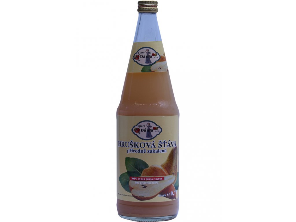 Hrušková šťáva přírodně zakalená 100% šťáva. Složení: hruška - obsah ovoce 100%. Výživové údaje ve 100ml: energetická hodnota 173kJ/41kcal; bílkoviny 0,1g; sacharidy 9,6g z toho cukry 8,1g; tuky <0,1g z toho nasycené mastné kyseliny 0,02g, balastní látky 0,3g; Sodík 0,001g Záloha na lahev: 4Kč EAN: 4024101001021Doplňkové parametry