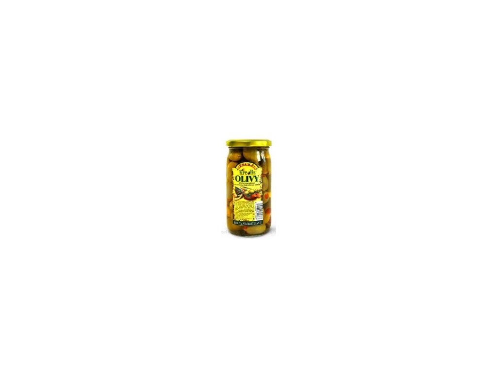 Olivy ve slaném nálevu pasterizované. Řecké olivy mají větší obsah oleje, jsou tak jemnější a nemají „dřevitou“ chuť. Slupka těchto oliv není tvrdá. Kreolis olivy nejsou nikdy barvené. Mají vždy zachovanou svoji přírodní barvu získanou přirozeným zráním. Takzvané kalamata olivy mají svoji charakteristickou tmavou barvu díky svému druhu. Mají přitom určité odchylky barevnosti, to ale jen dokazuje, že se jedná o 100% přírodní produkt bez chemických přísad. Složení: zelené olivy 49%, voda, jedlá sůl 4%, MANDLE 3%, česnek 3%, papriková náplň 2%(voda, mělněná paprika, stabilizátor: alginát sodný, guarová guma, chlorid vápenatý, jedlá sůl, konzervant: sorban draselný, regulátor kyselosti: kyselina citrónová), regulátory kyselosti: kyselina mléčná, kyselina citrónová. Může obsahovat pecky a jejich úlomky. Výživové údaje na 100g: energtická hodnota 724kJ/175kcal, tuky 17,1g z toho nasycené mastné kyseliny 2,6g, sacharidy 2,4g z toho cukry 1g, bílkoviny 1,5g, sůl4g EAN: 8594024791867Doplňkové parametry