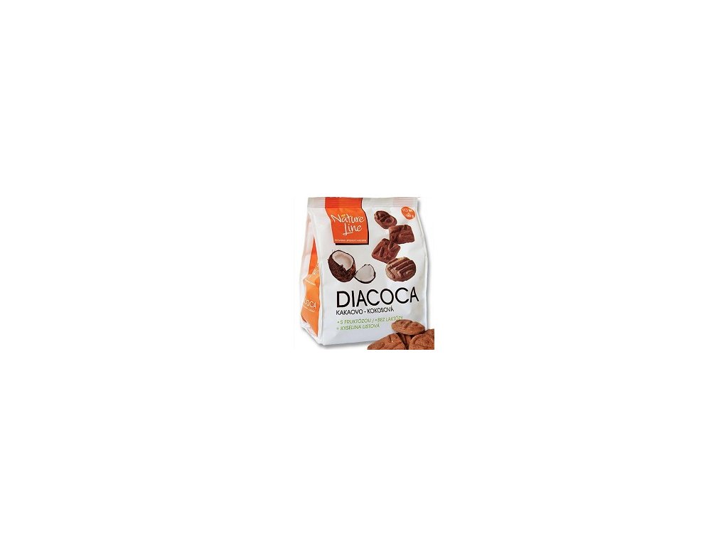 Sušenka Diacoca DIA. Sušenky kakaovo-kokosové s fruktózou. Vhodné i pro diabetiky. Složení: pšeničná mouka*, margarin (palmový tuk, řepkový olej, voda, emulgátory: /mono- a diglyceridy mastných kyselin, lecitiny/, sůl, konzervant /kyselina sorbová/, kyselina citronová, fruktóza 20%, kakaový prášek odtučněný 3,4%, strouhaný kokos 2,7%, pšeničný škrob*, sušená vejce*, aromata, kypřidla: uhličitany amonné a sodné, kyselina listová. * alergeny Může obsahovat arašídy, skořápkové plody, mléko, sóju a sezam. Výživové údaje ve 100g: energetická hodnota 1993kJ/476kcal; tuky 21g z toho nasycené mastné kyseliny 10g; sacharidy 62g z toho cukry 17g; bílkoviny 8,3g; vláknina 5,6g, sůl 0,21g. EAN: 8586008104114Doplňkové parametry