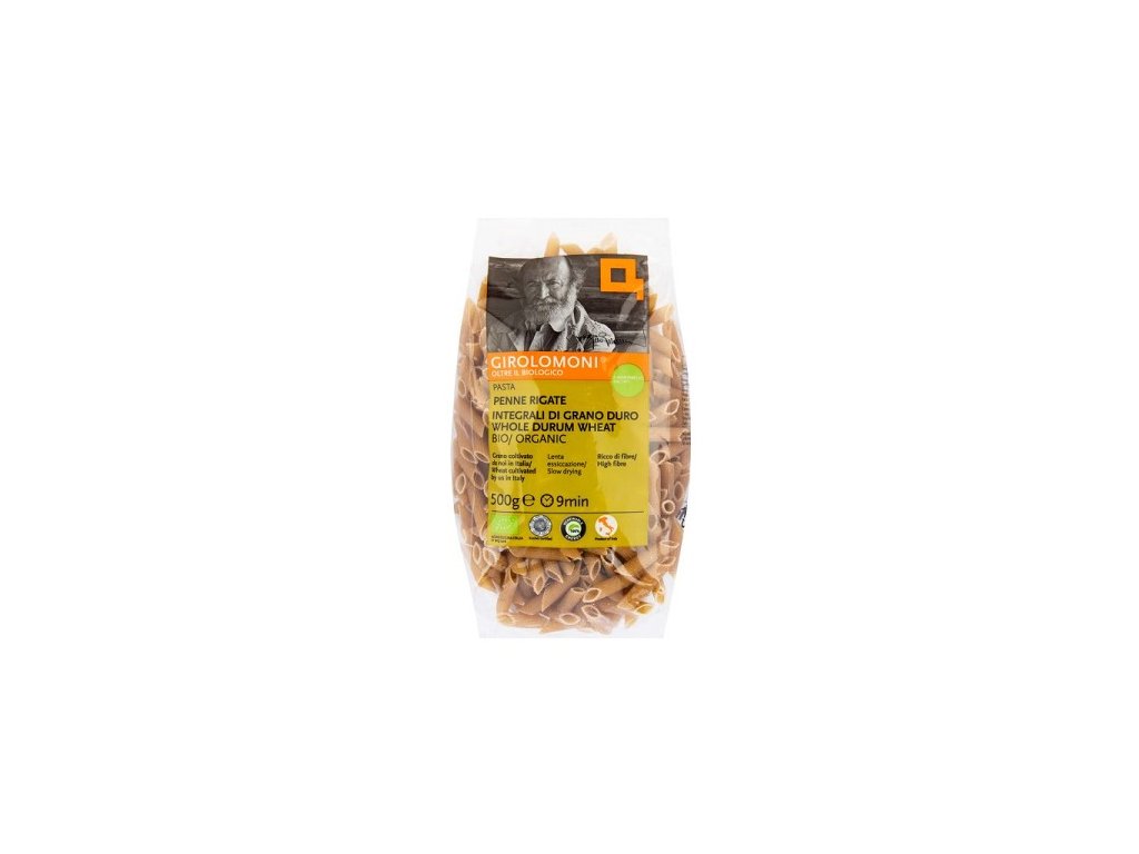 Těstoviny penne celozrnné. Složení: tvrdozrnná celozrnná PŠENIČNÁ krupice*. Může obsahovat stopy sóji. *produkt kontrolovaného ekologického zemědělství Alergeny: lepek Výživové údaje na 100g: energetická hodnota 1552kJ/367kcal, tuky 2,3g z toho nasycené mastné kyseliny 0,4g, sacharidy 70,7gz z toho cukry 3g, vláknina 8g, bílkoviny 11,8g, sůl 0,01g EAN: 8032891760017Doplňkové parametry