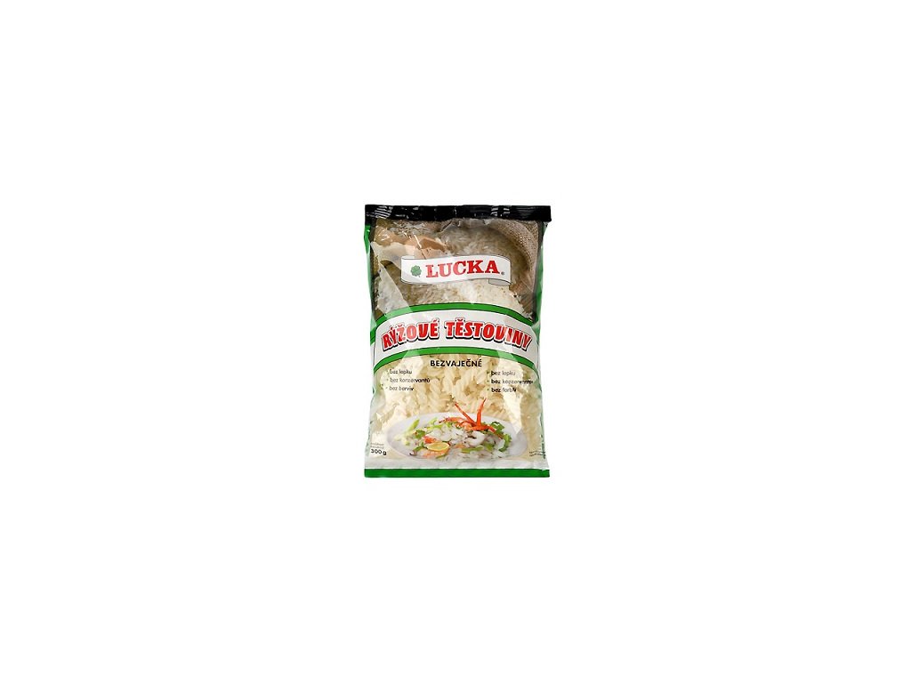 Rýžové těstoviny zn. LUCKA jsou zcela bez konzervantů, barviv, cholesterolu a veškerých alergenů, tzn. i bez lepku, takže potěší i celiaky. Jsou vyráběny z vysoce kvalitní a čestvě mleté rýže bez dalších chemických úprav. Tím získávají svoji jemnost a poctivou chuť. Tím, že se rýžové těstoviny nerozváří a nelepí se, dají se dobře zapékat nebo dohřívat. Složení: rýžová mouka, přírodní tapiokový škrob, sůl. Dejte vařit vodu (1 litr vody na 100 g těstovin) trochu osolit (v případě polévkových hvězdiček ještě lžičku rostlinného oleje). Těstoviny vložte do vroucí vody a za občasného míchání vařte 8 - 12 minut. Jakmile jsou těstoviny uvařené, zceďte vodu. Poté je dobře propláchněte tekoucí vodou a nechte okapat. Přidejte trochu rostlinného oleje, promíchejte a můžete servírovat. Výživové údaje na 100g: energetická hodnota 1448kJ/346kcal; tuky 0,4 g z toho nasycené mastné kyseliny 0,2g; sacharidy 82,3 g z toho cukry 1,58g; bílkoviny 3,42g; sůl 0,49g. EAN: 8936021031896Doplňkové parametry